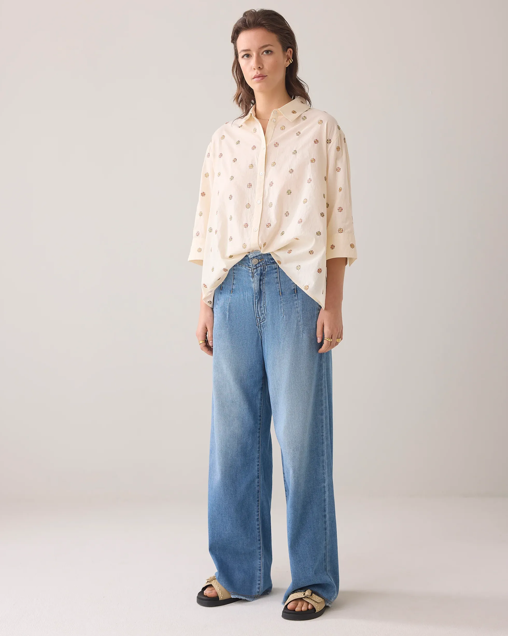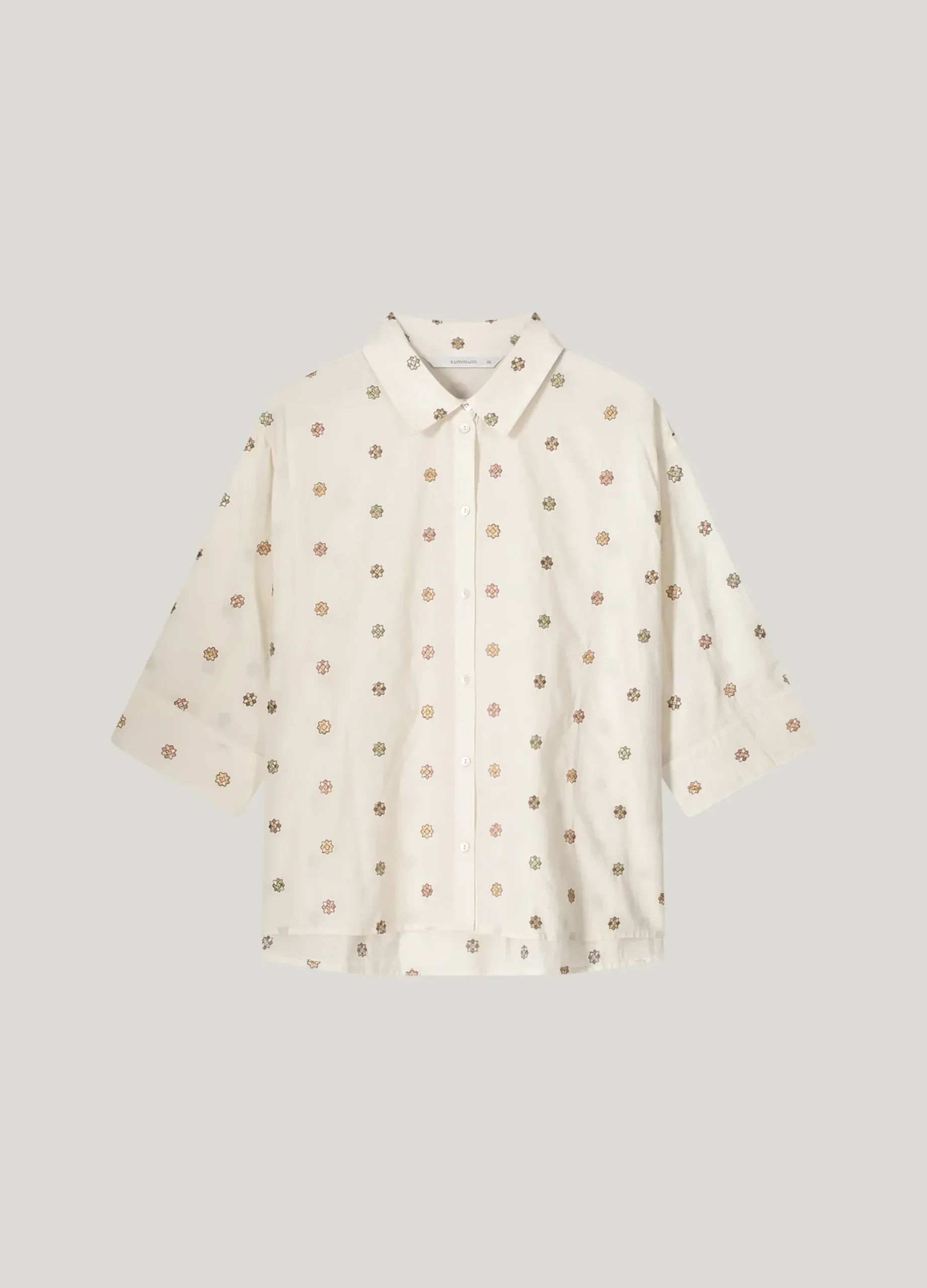 This cotton A-line blouse has three-quarter wide sleeves and is made of small flowers embroidered with lurex thread. The blouse is a wide-fitting model with no collar.