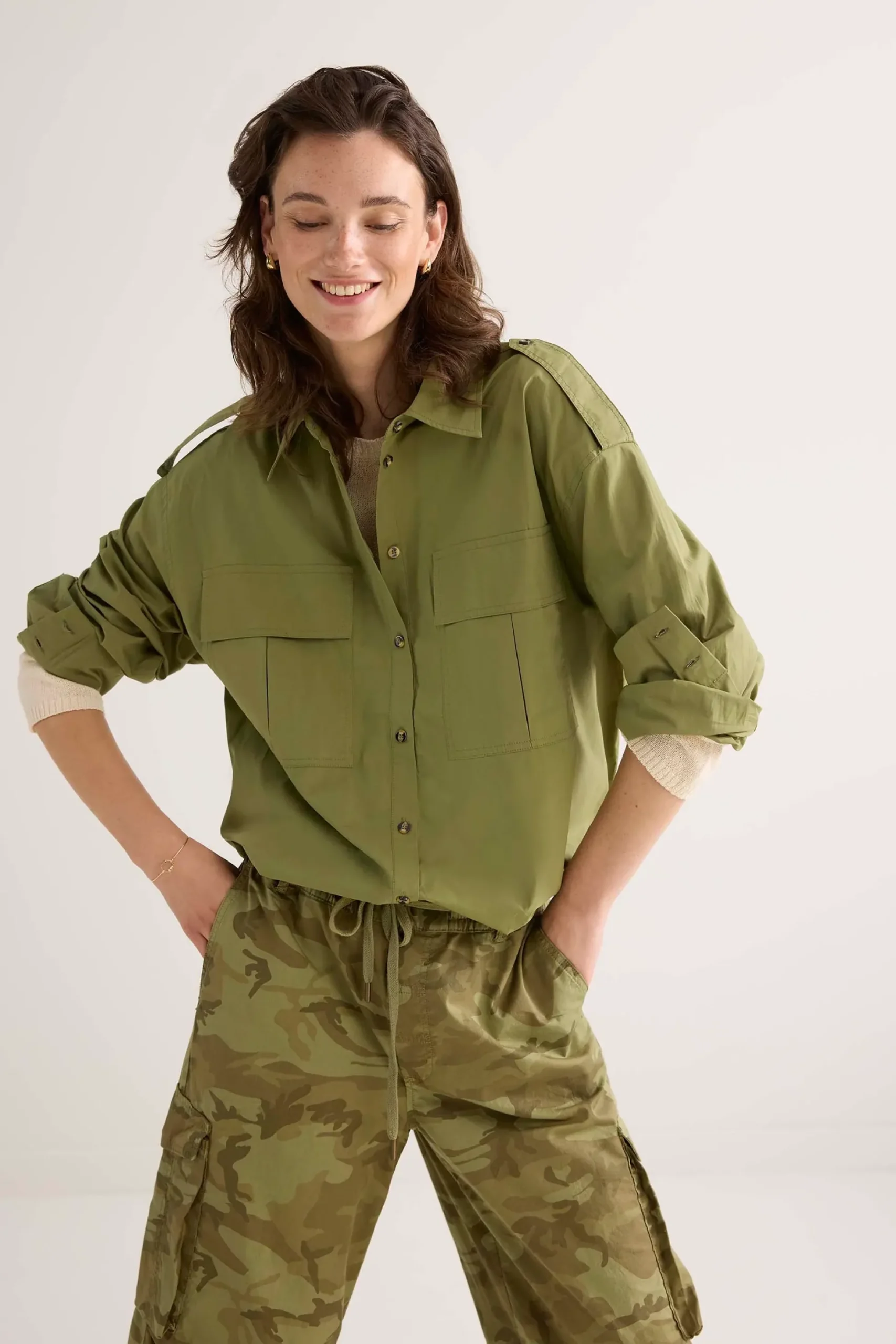 This shirt blouse is designed in army style with epaulettes on the shoulders and front flap pockets. The crispy poplin cotton fabric gives the blouse a cool look.
