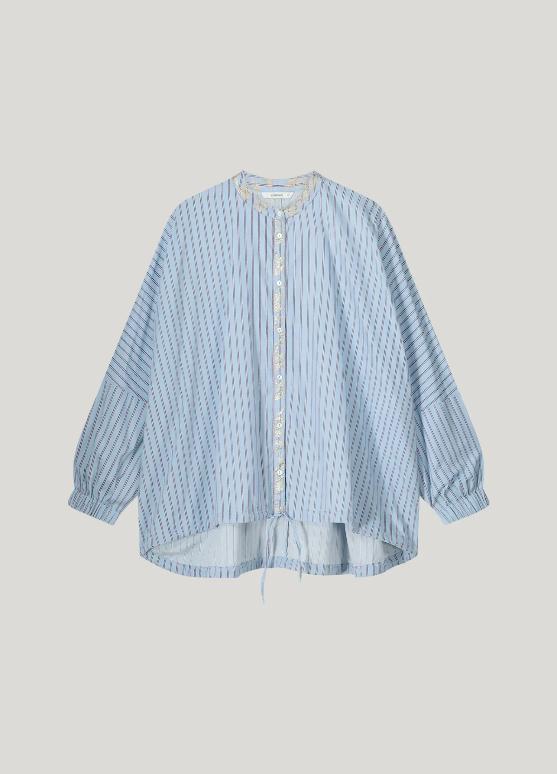 This oversized stripe blouse has long balloon sleeves with elasticated cuffs. The neckline and button placket is printed with a metallic pattern and there is a drawstring at the hem.