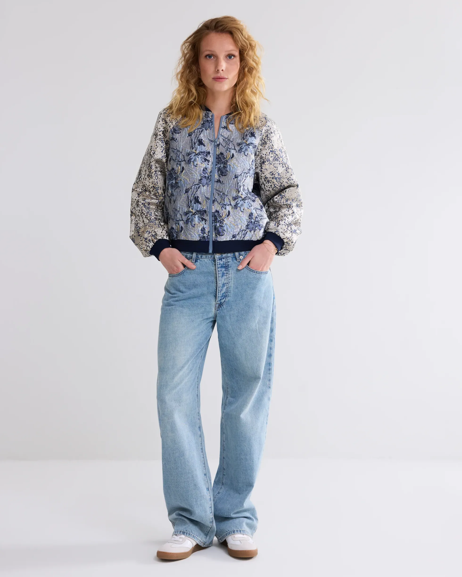 This bomber jacket has a round ribbed neckline and is made of two different jacquard designs. The jacket is lined, has long sleeves, a zip fastening and elasticated cuffs and hem.