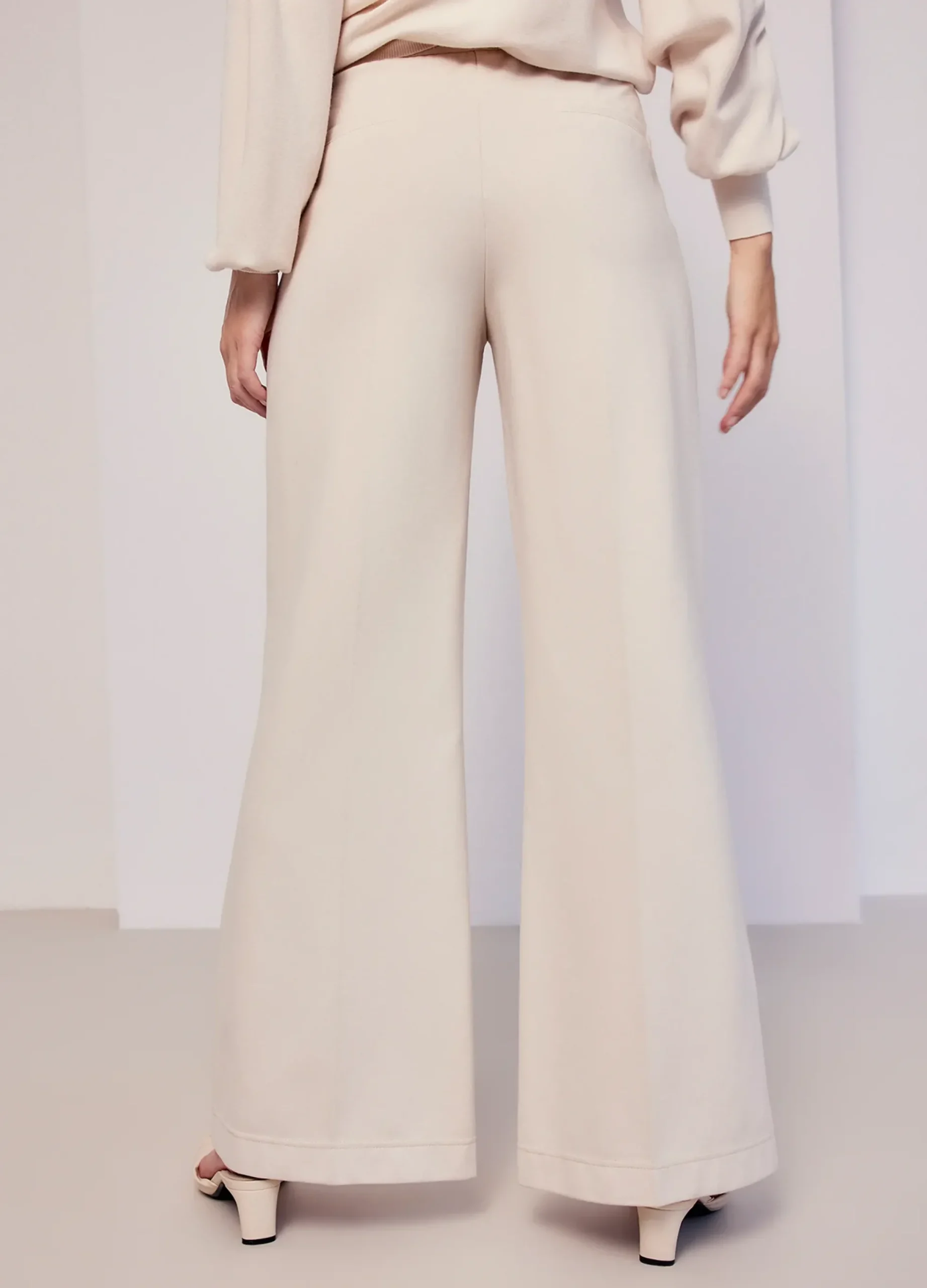 Wide-leg, boot-cut trousers with a permanent press fold, front slit pockets and stitched welt pockets at the back. The back of the waistband feature elastic with the Summum logo. Inseam is approximately 82cm for all sizes.