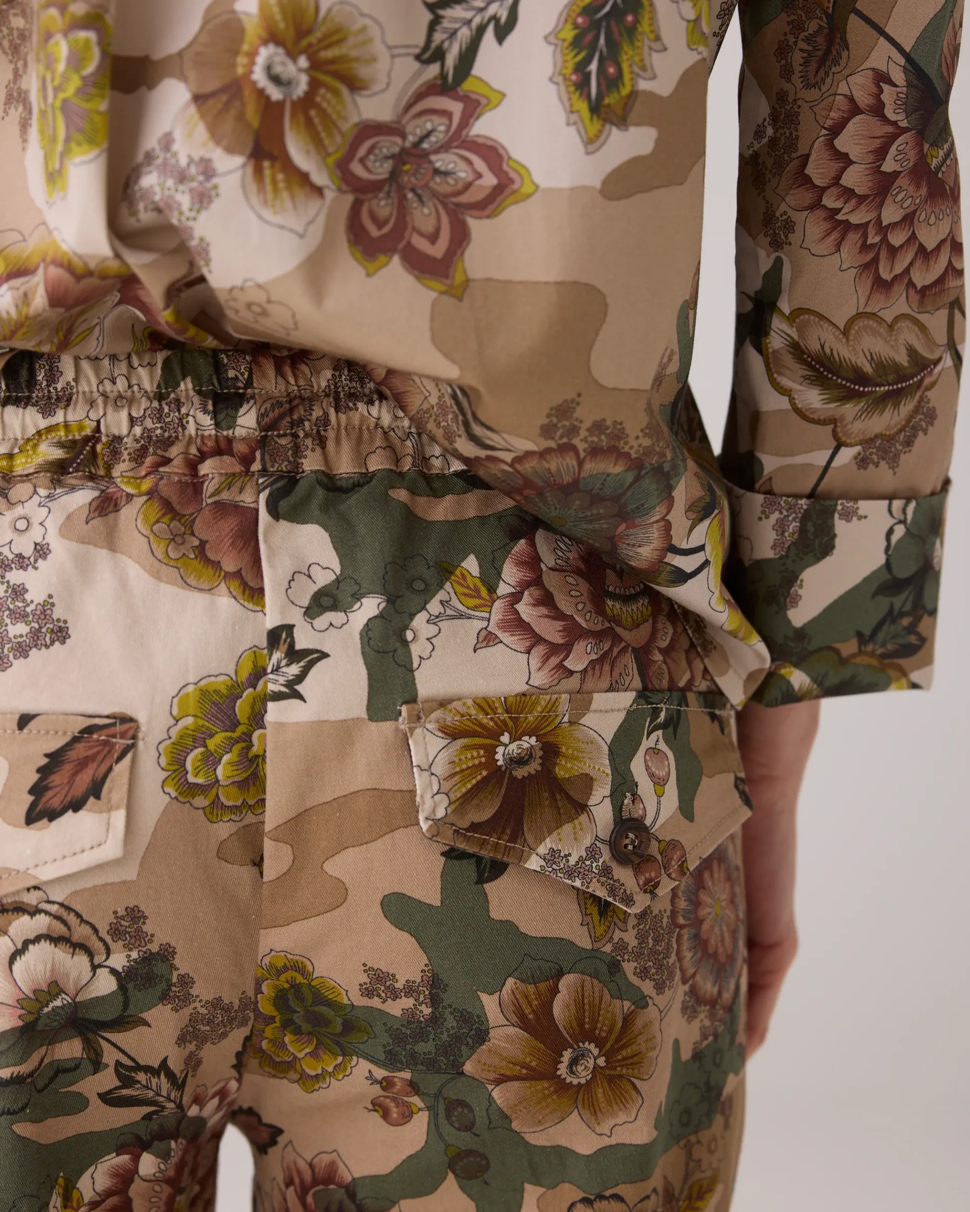 These trousers in sturdy stretch cotton have an all-over camouflage print with flowers. The trousers have an elasticated waistband with a lacing cord.