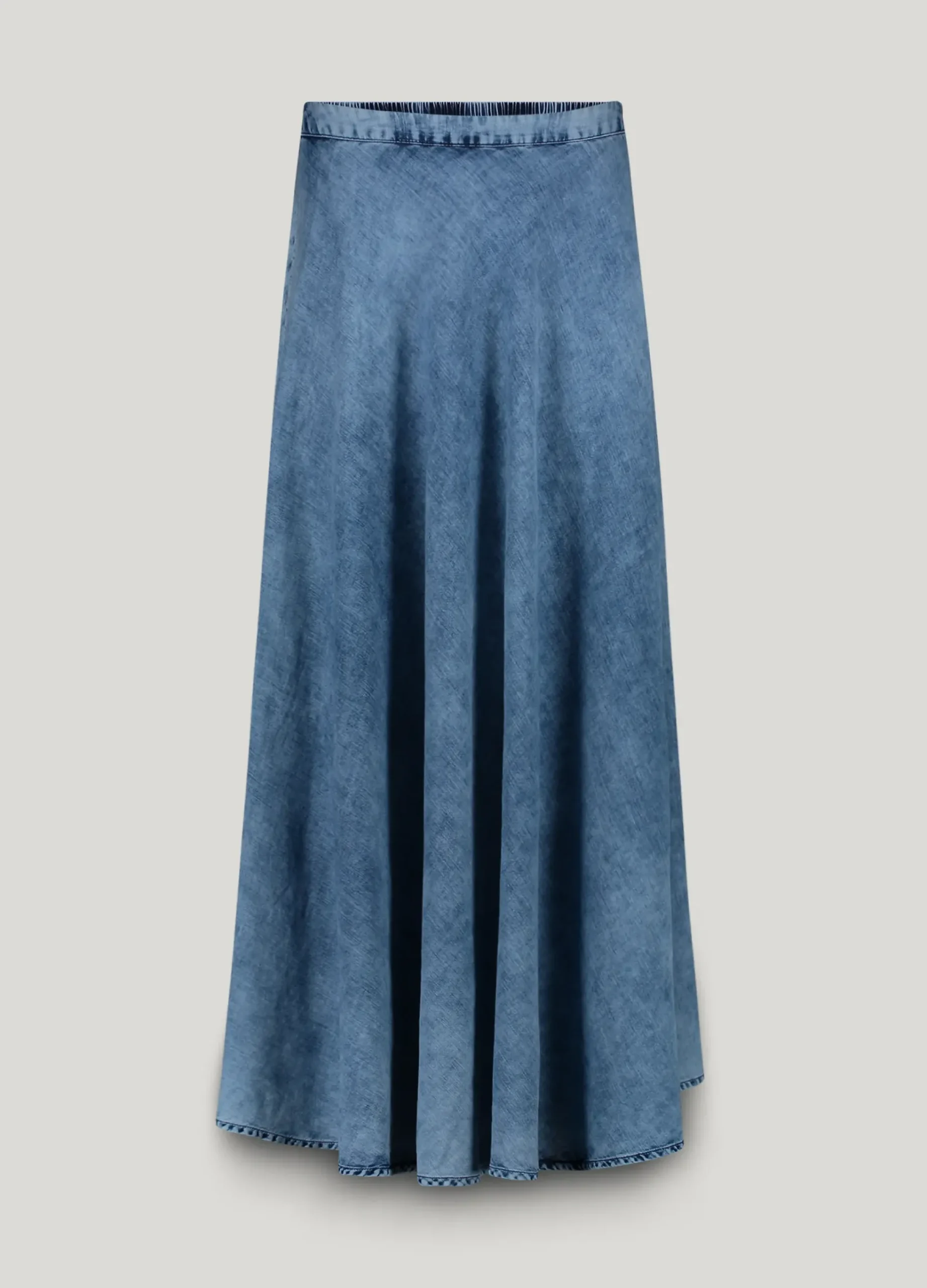 This flowing, long skirt made of washed indigo denim has a comfortable elasticated waistband at the back. The light fabric creates a graceful, airy look.