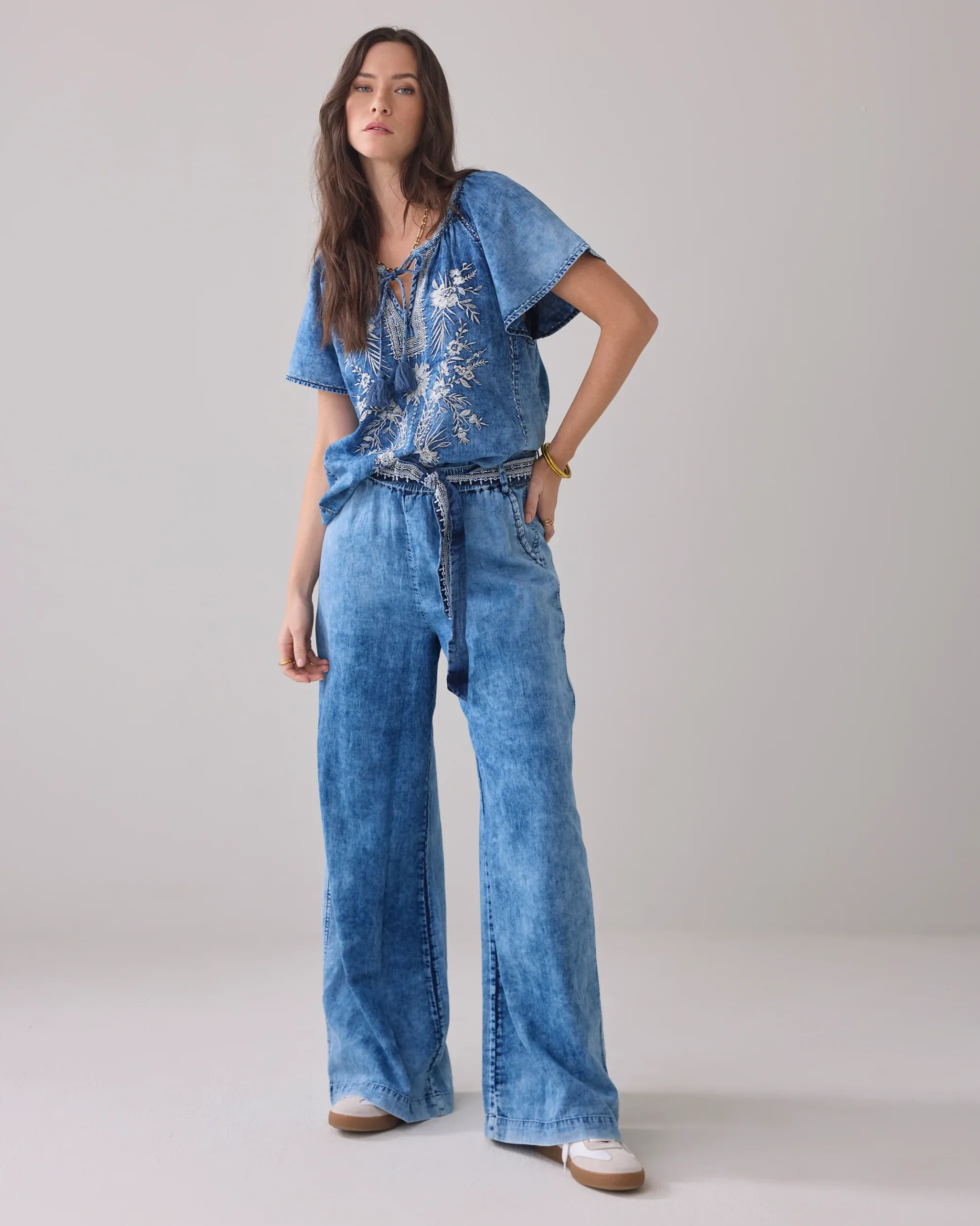 These wide-fitting cotton trousers are made from a super-soft denim. The trousers have a richly embroidered belt and pockets in the side seam.