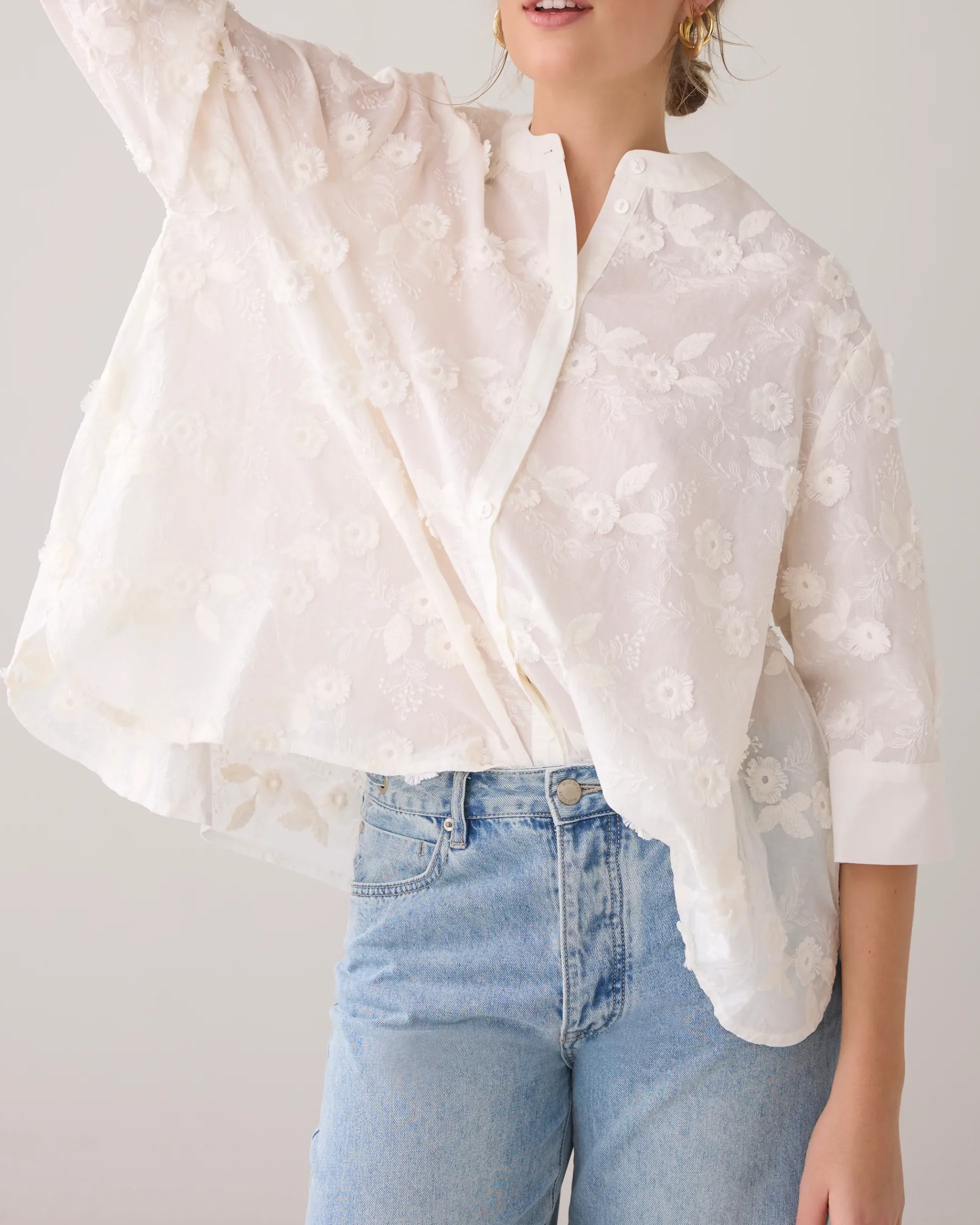 This cotton A-line blouse has three-quarter wide sleeves and is made of a 3D floral design. The blouse is a wide-fitting model with no collar.