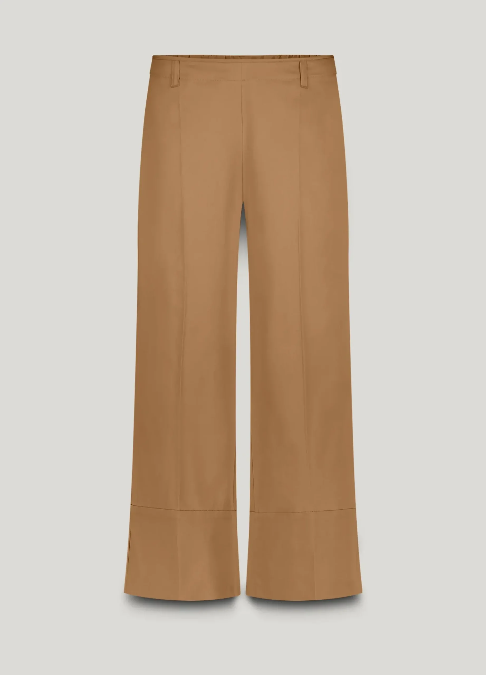 These 7/8th length trousers have a straight fit with a wide hem and side slits. The trousers have an elasticated waistband at the back and smooth waistband at the front.