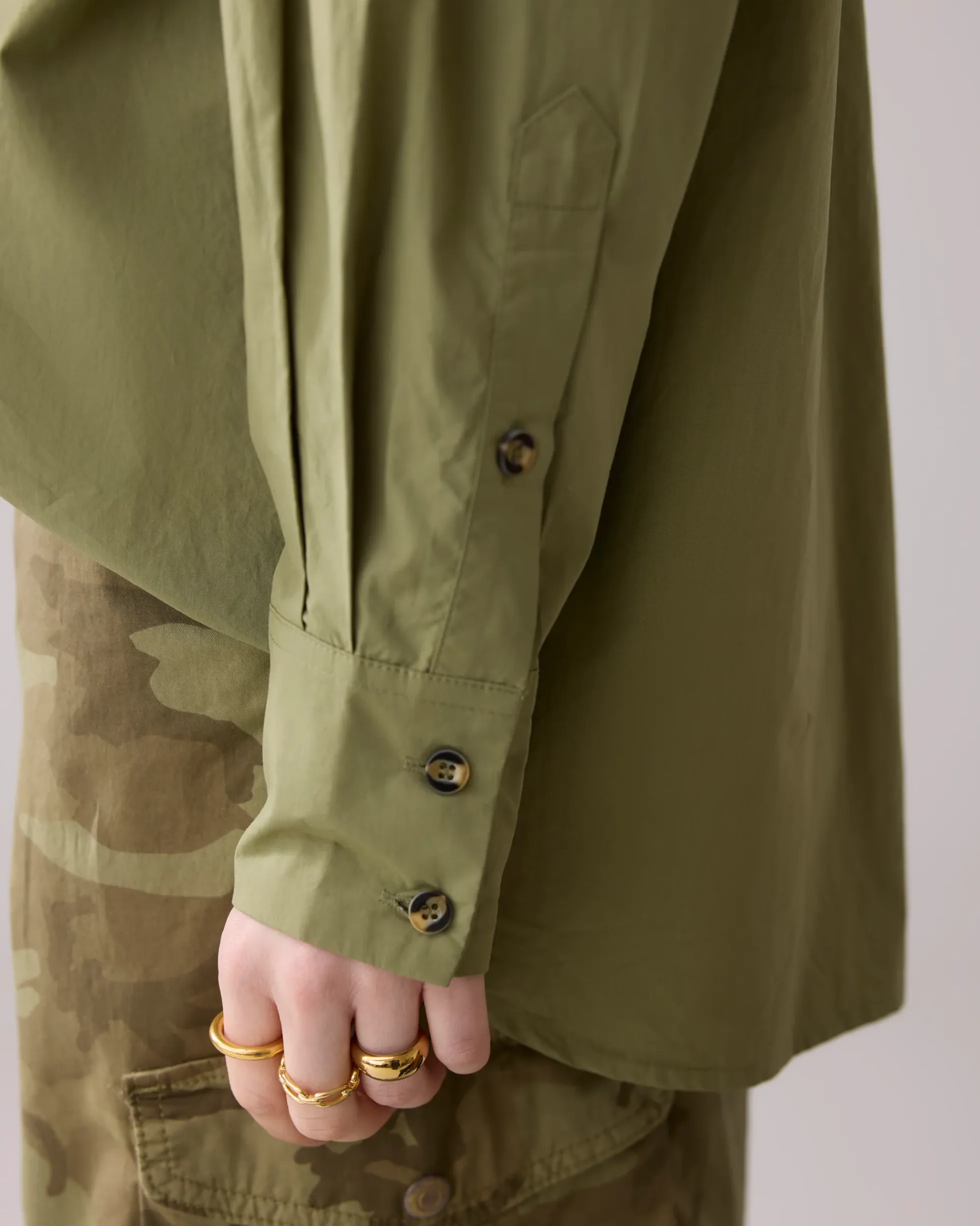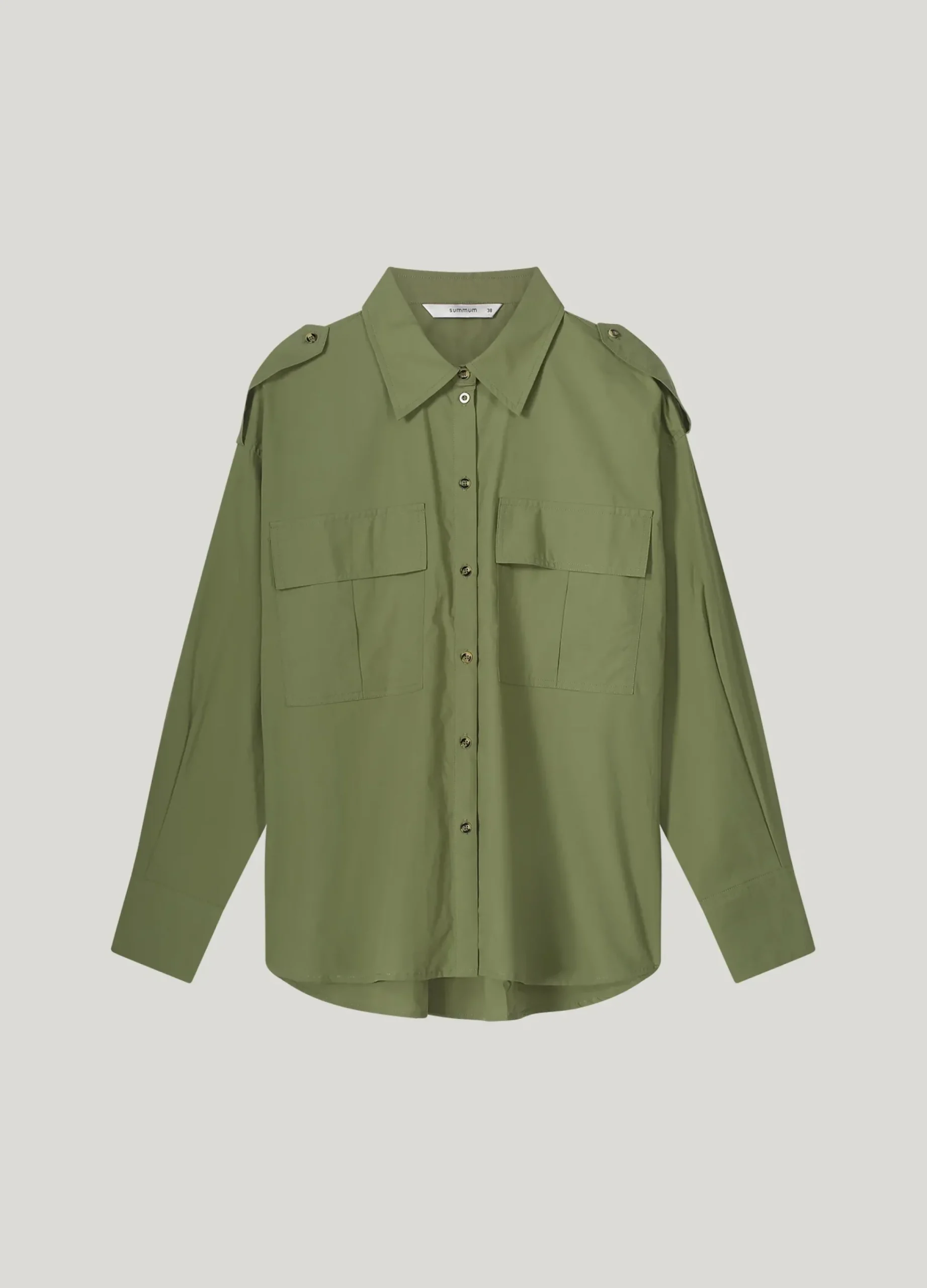This shirt blouse is designed in army style with epaulettes on the shoulders and front flap pockets. The crispy poplin cotton fabric gives the blouse a cool look.