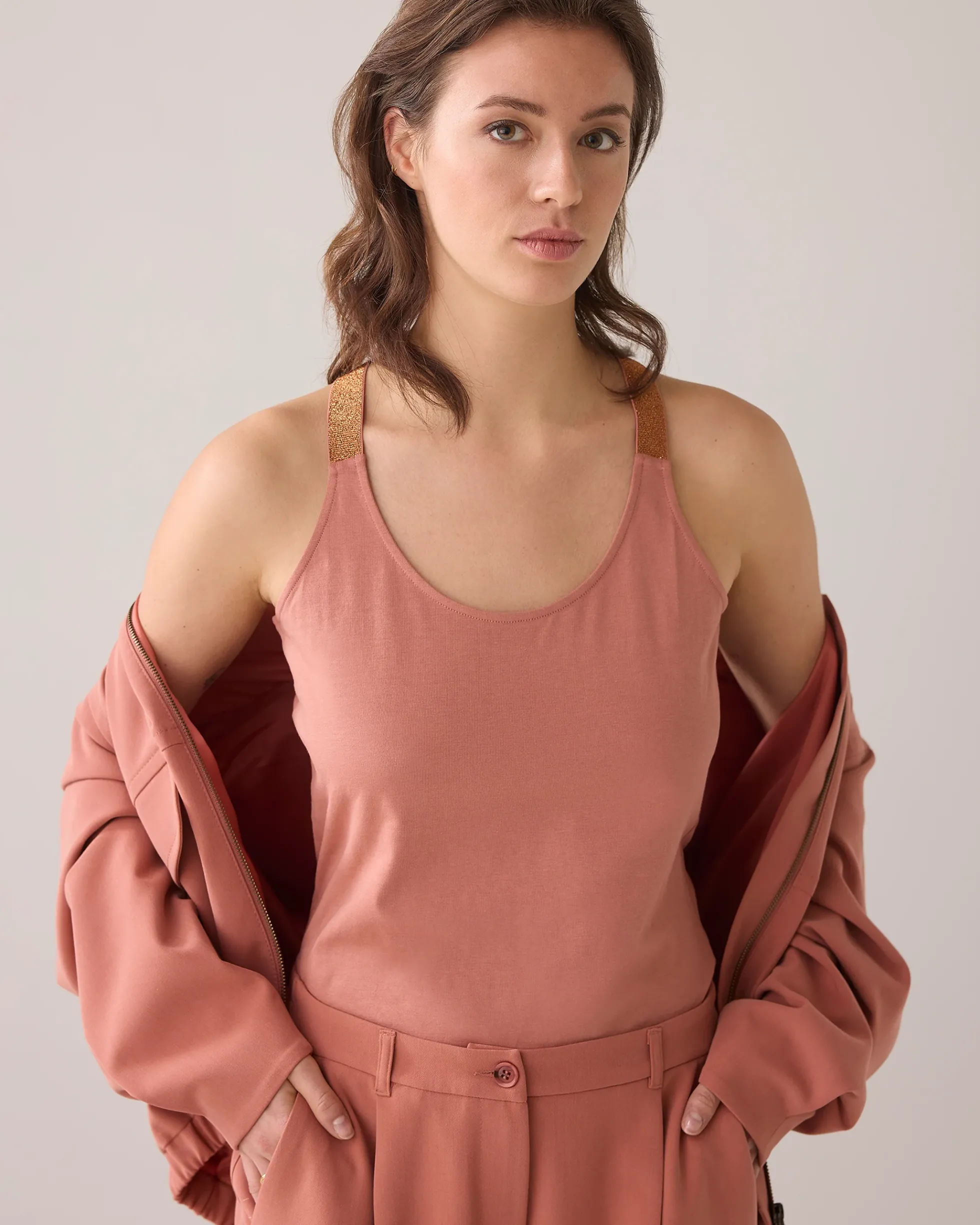 Basic singlet with a cross band at the back, made of cotton elastane jersey fabric. This slim-fit top has eye-catching glittery straps.