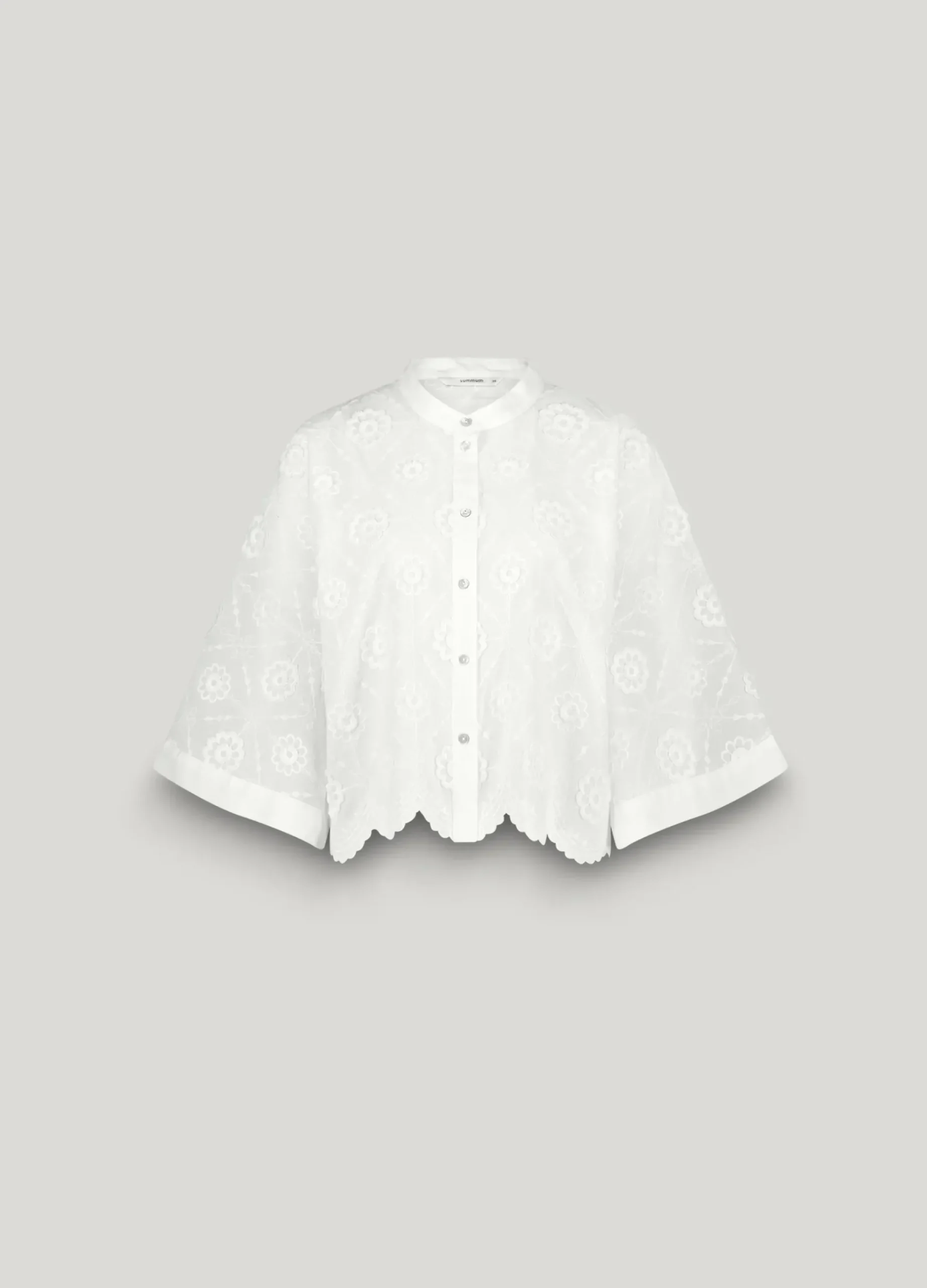 This boxy blouse is made of cotton with a 3D floral texture. The blouse has wide, cropped kimono sleeves and a scalloped hem.
