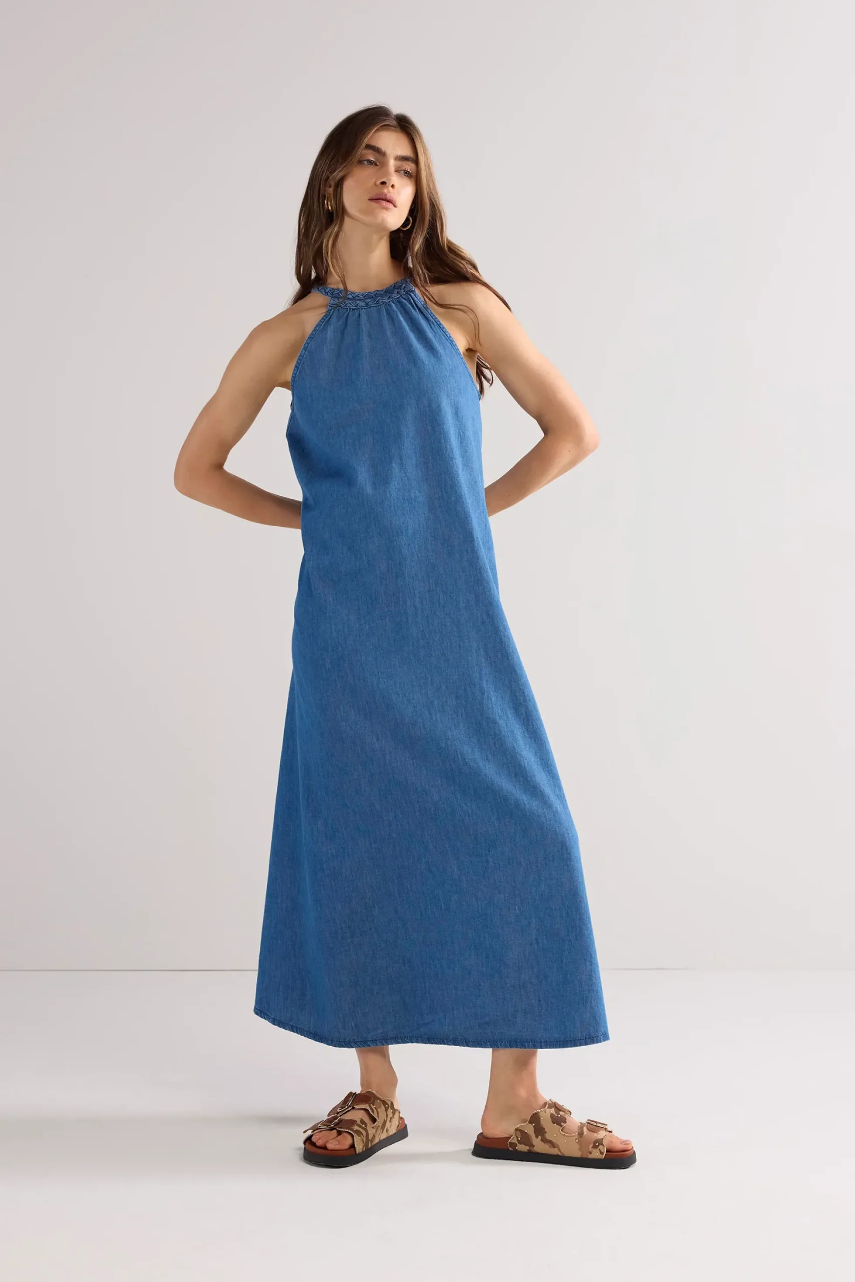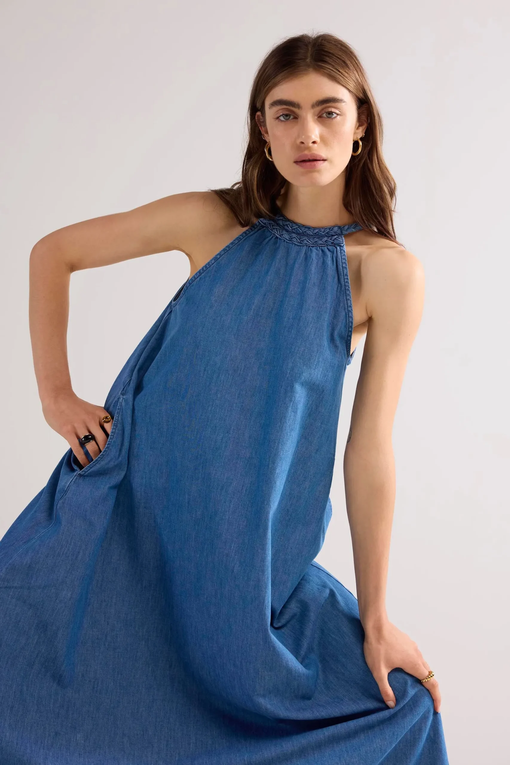 This halter dress is made of soft cotton and has a flared fit. The dress has a striking, adjustable button closure made of braided denim and hidden side pockets in the side seam.